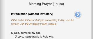 In the new versions, you use the blue arrow next to the Introduction to an Hour to change between the “with Invitatory” and “without Invitatory” versions of the Introduction. Here is how things look when you start, with an Introduction that doesn’t include the Invitatory: