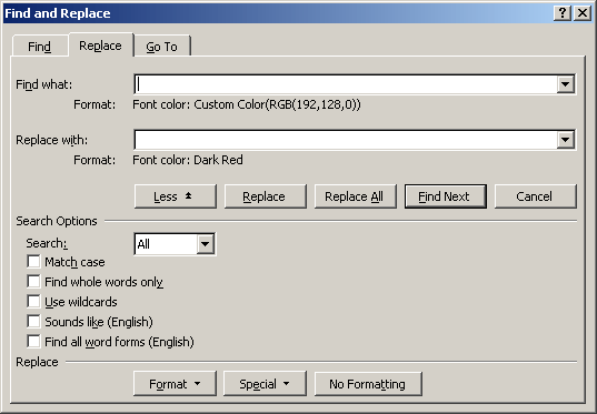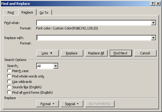 Then press OK, and OK again, until you are back in the Replace dialog box. You’ll see that the “Find what” box now has a colour listed under it:
