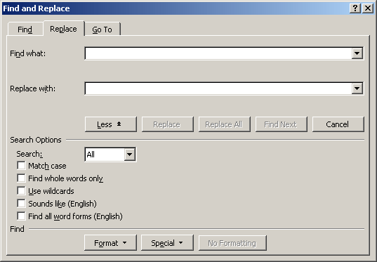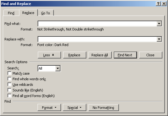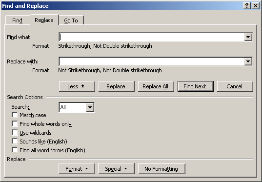 The Replace dialog box will now look like this. Check that the “Find What” box says Not Strikethrough, because this is important.