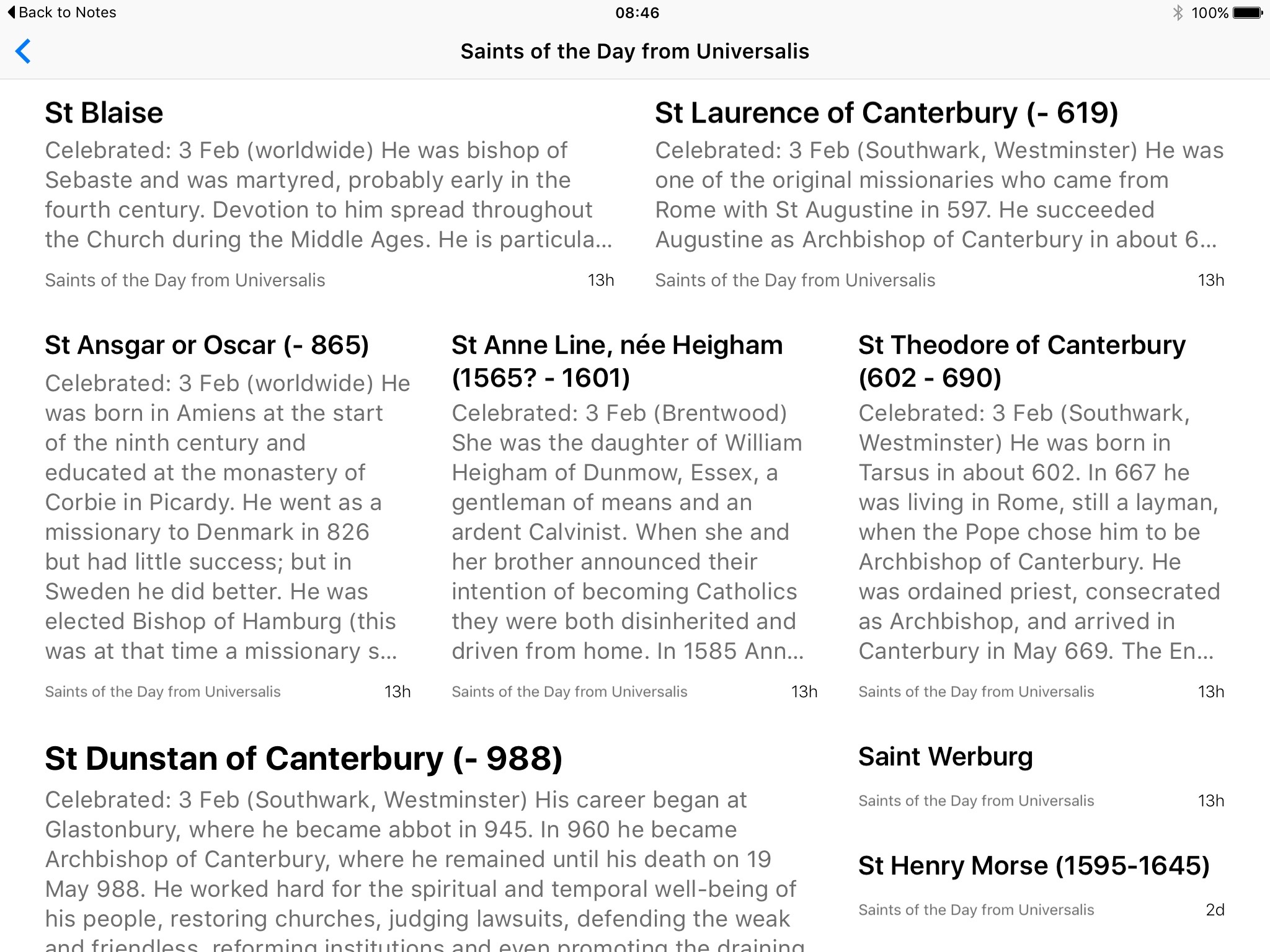 Here is what an Apple News screen looks like on the iPad when our Saints of the Day feed is selected: