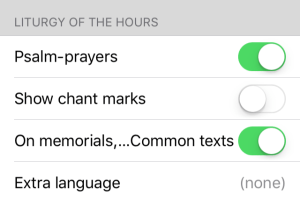 3. The “Settings” screen will appear. It is divided into sections. Scroll to the “Liturgy of the Hours” section.
